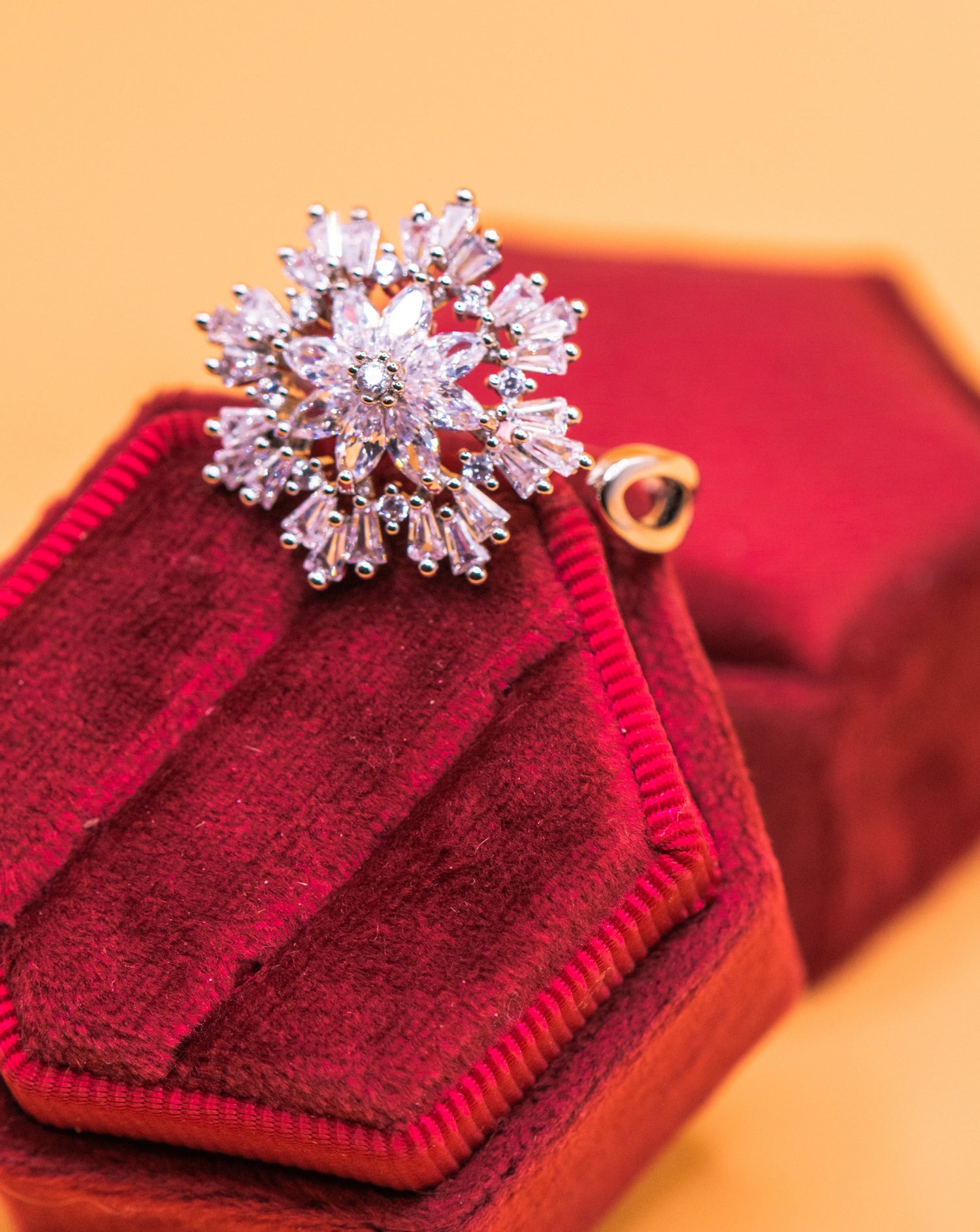 Show your whole day more sparkle and full of possibilities with this little piece of frosty shimmer, the Camila Ring. This dainty little snowflake charm is fashionably beautiful and dazzling seamlessly to a fabulous gown. Snowflakes rings are the perfect example of the special qualities and characteristics that make someone unique and remarkable. It also signifies purity and rebirth - Snow falls, melts, evaporates, and can once again be reborn a completely unique snowflake. It’s a beautiful thing when sparkle meets sparkle.