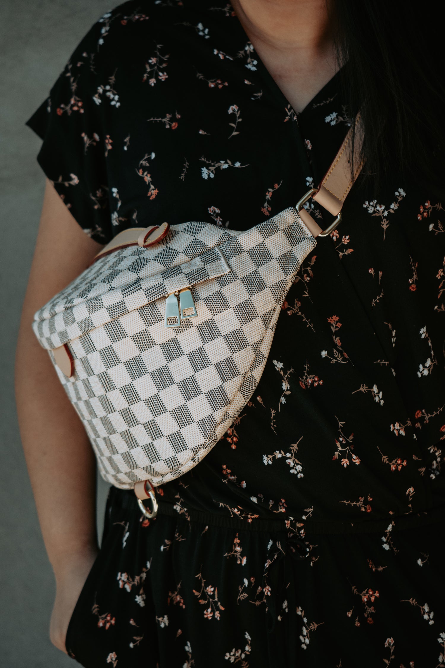 - Adjustable strap with gold hardware