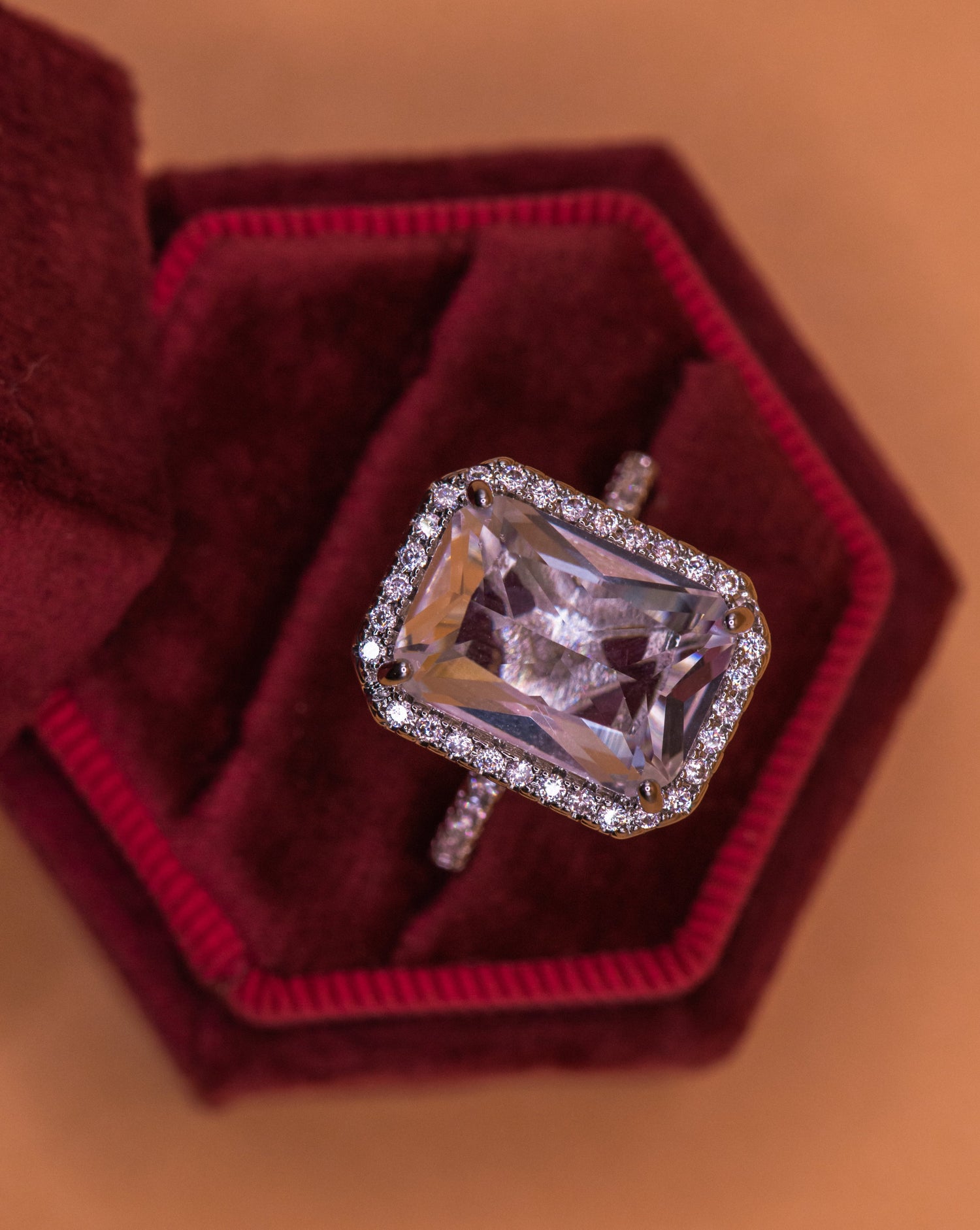 With our Florence Ring, you'll get your daily dose of gleam. This emerald-cut diamond-like ring has a single band adorned with sparkling stones and exudes perfect elegance. The emerald-cut indicates that the wearer is sophisticated and bold. In recent years, this fancy emerald-cut shape has been spotted all over the place, spotted on the left hands of several A-list celebrities.