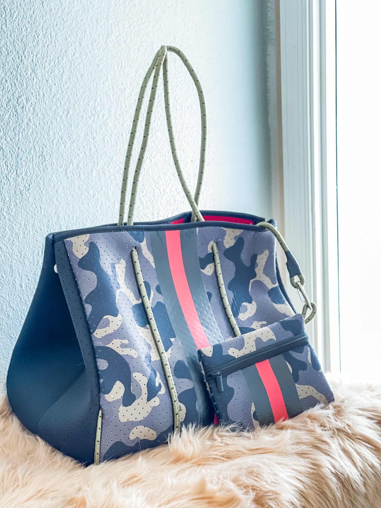 Juno - Dark Camo with Red Striped Neoprene Tote