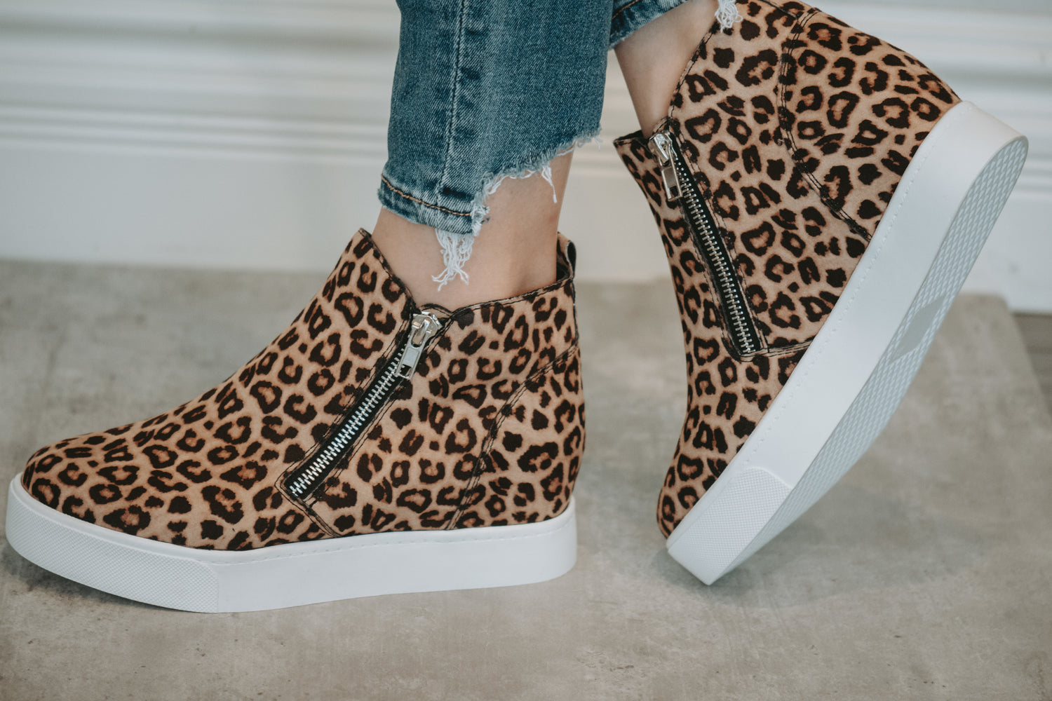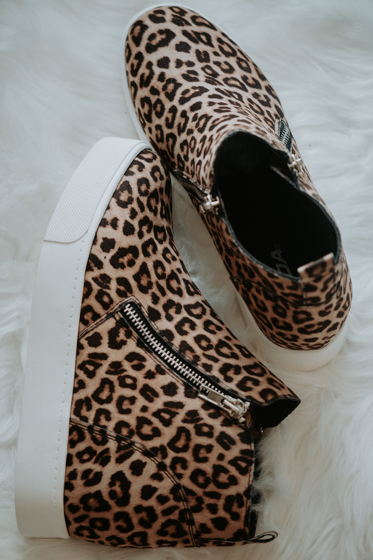Looking for a street vibe sneaker style footwear? Try this Taylor Cheetah Wedge Sneakers all out with glam and cool design. The entire sneakers are covered in a light tan and black cheetah print and have an inner zipper for easy on/off access. A rounded toe keeps the classic sneaker feel while elastic detailing in the front keeps them trendy. Pair it with anything from skinny jeans to joggers.