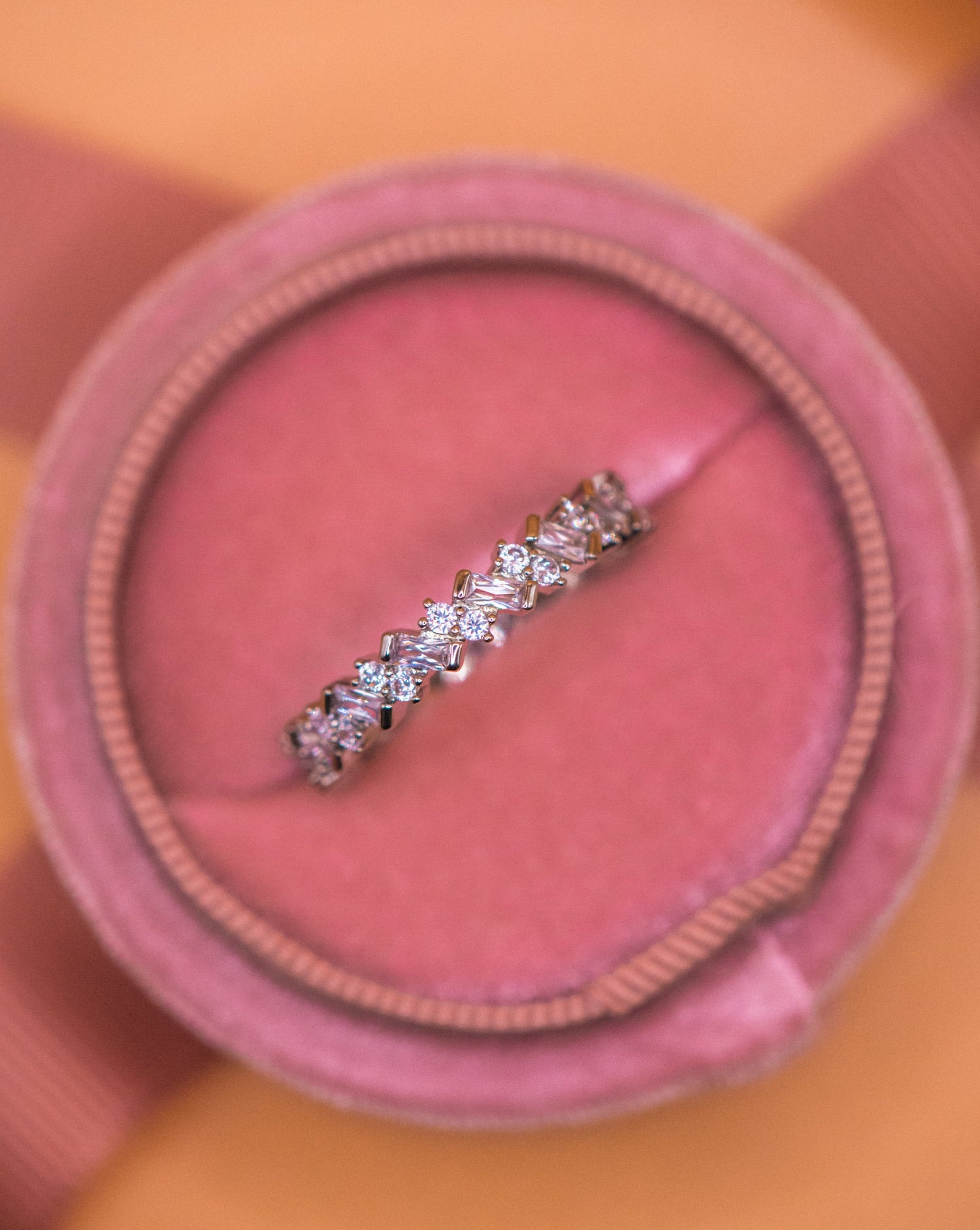 Taylor ring is a gorgeous cluster of dainty white triple-A Cubic Zirconia gem, scattered on a thin premium 925 sterling silver plating band perfectly made to match each other. It is safe and sturdy. This is a perfect option for the one seeking a piece that is both simple and unique.
