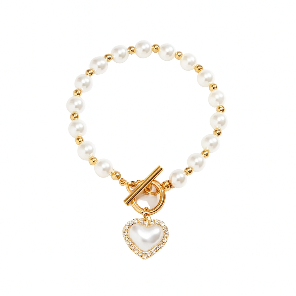 The Vera Love Faux Pearl Heart Bracelet combines elegant gold-tone metal with lustrous faux pearls for a timeless accessory. Featuring a toggle clasp for easy wear and adjustment, this bracelet adds a refined touch to both casual and formal outfits. Its delicate heart detail makes it a sophisticated piece that enhances your jewelry collection with subtle charm and expert craftsmanship.